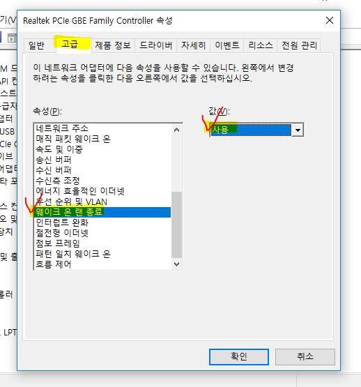 그리고 [고급] 탭에 가시면 “웨이크 온 랜 종료” 라는 항목이 있으실꺼에요. 그걸 위처럼 “사용”으로 변경해줍니다.