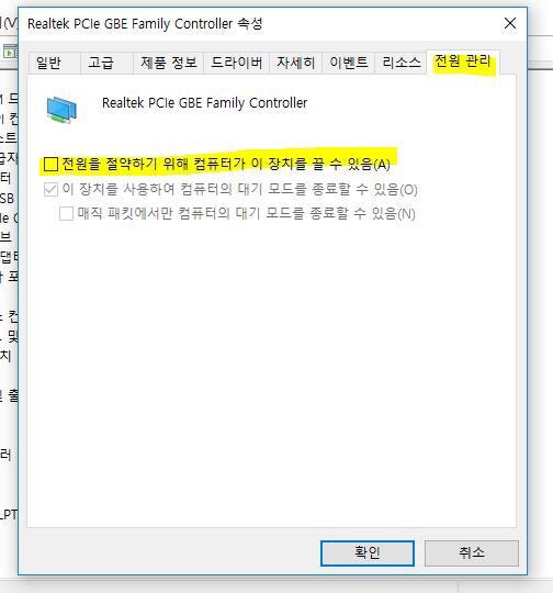 그리고 [전원 관리] 탭에 가셔서 위 부분에 체크를 해제해주세요.