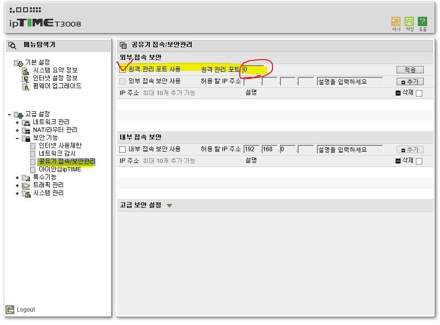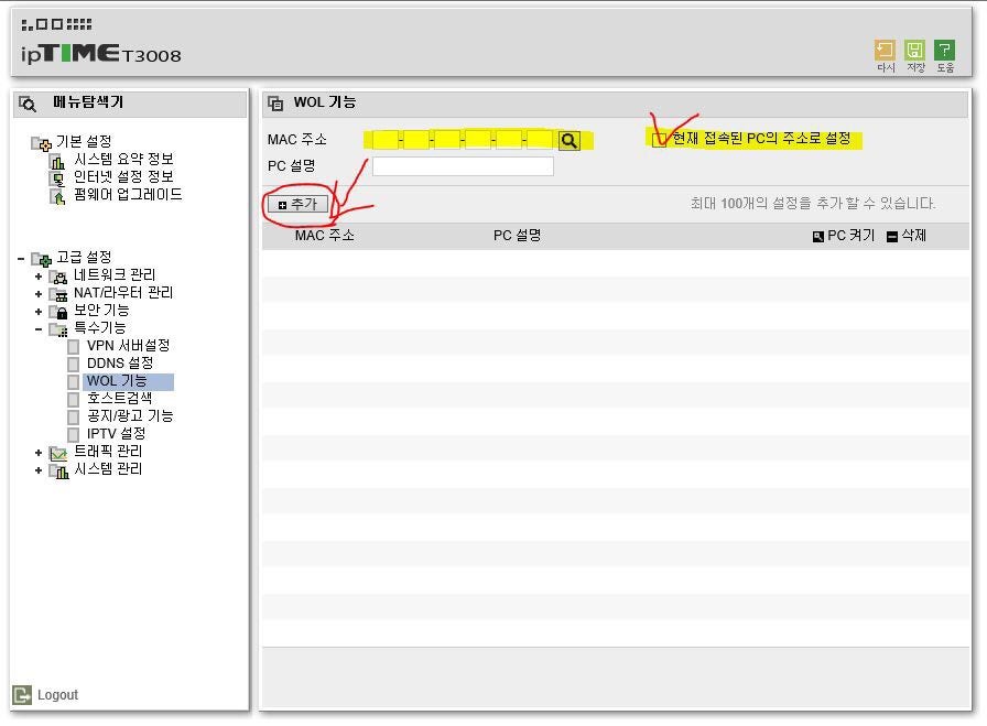 [고급설정] -> [특수기능] -> [WOL기능] 으로 들어가주세요.
