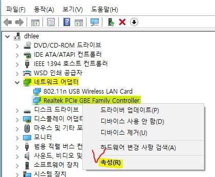 그리고 네트워크 어댑터를 클릭하시면 보통 하나만 보이실꺼에요 (필자는 랜카드가 2개 있어서 저렇게 보입니다.) 랜선을 실제로 꼽고 있는 랜카드를 확인해서 오른쪽 클릭하시고 “속성”을 눌러줍니다.